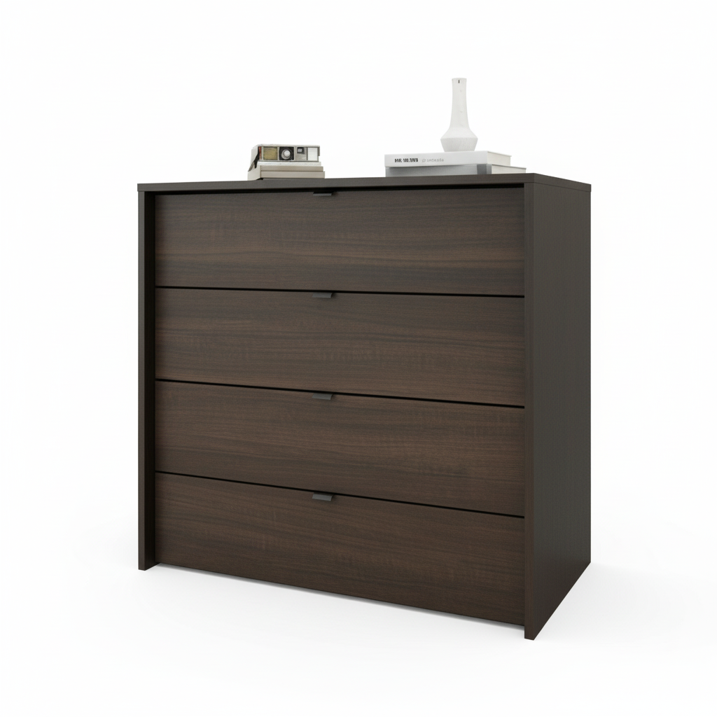 This sleek four-drawer chest features a rich, dark espresso wood-grain finish that provides a luxurious and grounded look to any room. Its handleless design with subtle finger pulls emphasizes the modern, clean-lined silhouette, making it an effortlessly sophisticated storage solution. Offering spacious storage, this durable chest is ideal for organizing clothing in a bedroom or serving as a stylish credenza in a living area or office.