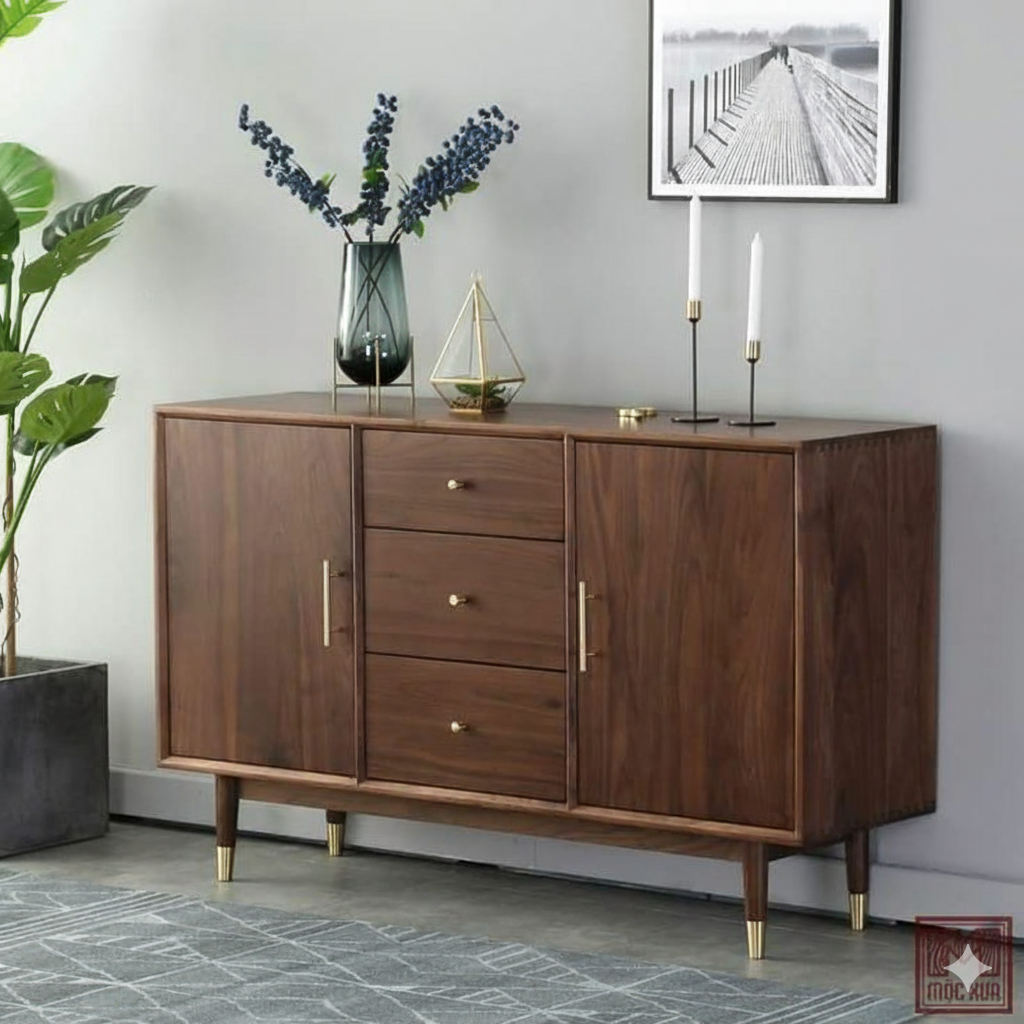 This stunning mid-century modern console table, crafted from rich walnut-finish wood, offers a perfect blend of style and utility for any room. It features three central drawers for smaller items and two spacious cabinets, providing ample storage behind clean, simple lines accented by sleek brass handles. Elevated by tapered legs with elegant gold caps, this versatile piece can serve beautifully as a sophisticated sideboard, an entry table, or a striking media console.
