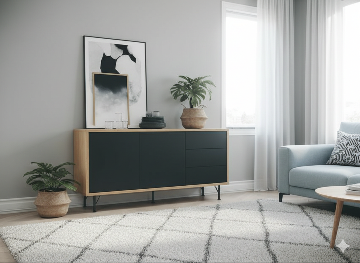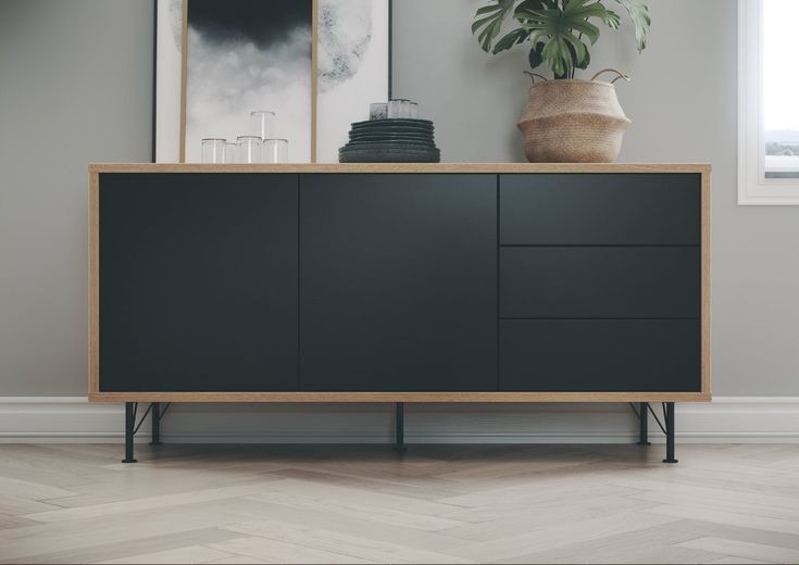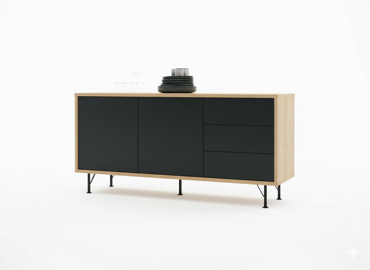 This striking modern sideboard features a sophisticated two-tone design, pairing a warm oak-finish frame with clean, matte black doors and drawers for a truly contemporary look. Offering exceptional storage, it includes two spacious cabinets and three convenient right-side drawers, making it perfect for organizing dining essentials or living room clutter. Raised on sleek, minimalist metal legs, this piece delivers a distinct mid-century modern aesthetic that will anchor any dining area or hallway with style.