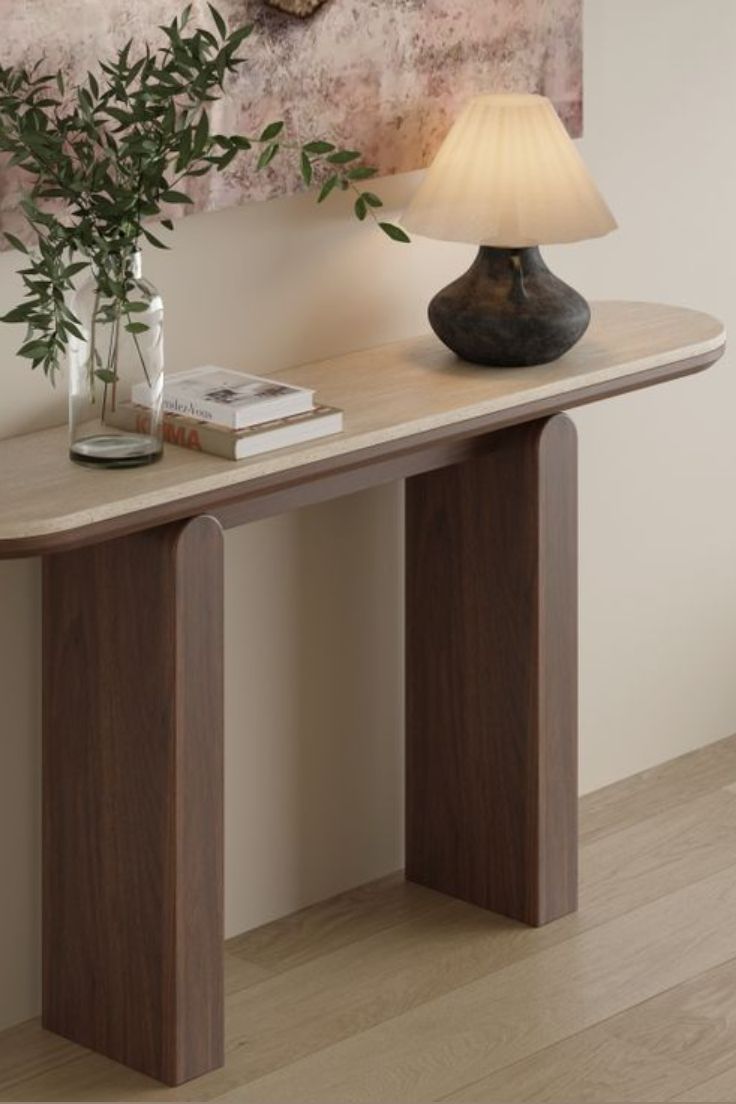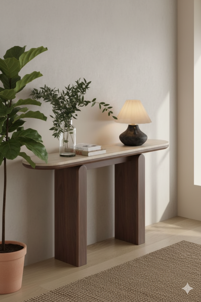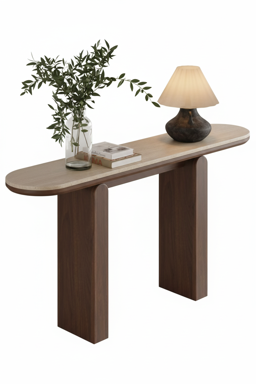 This striking modern console table features a unique elliptical tabletop with a light, natural wood grain, elegantly contrasted by two substantial, rounded dark wood legs. The minimalist, sculptural design brings an elevated, architectural element to any entryway, hallway, or living space. Offering a stylish display surface, this piece perfectly balances form and function, serving as an instant focal point in a contemporary setting.