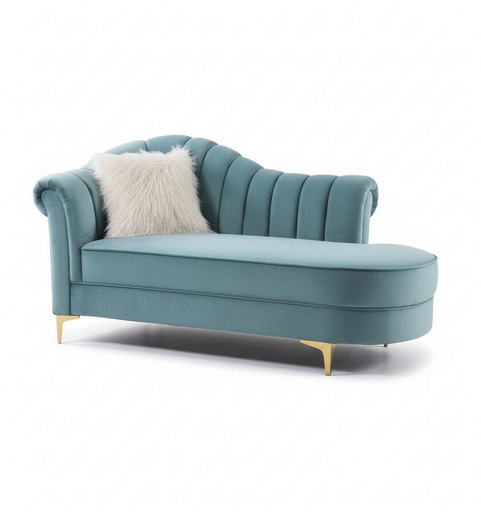 This glamorous chaise lounge makes a luxurious statement with its striking teal velvet upholstery and elegant channel-tufted backrest. Its contemporary curved silhouette is beautifully contrasted by sleek, angled gold-finish legs, adding a refined, modern touch. Perfect for creating a luxurious resting spot, this piece effortlessly combines comfort and high-end style for your living room, bedroom, or dressing area.