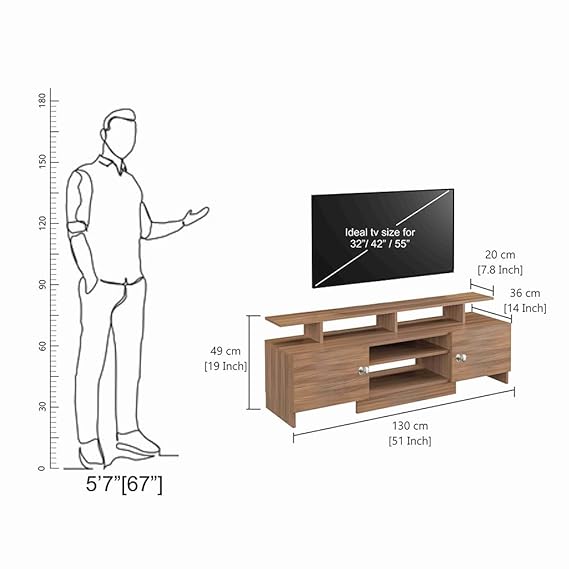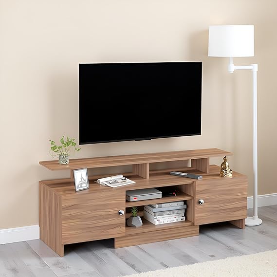 This contemporary 51-inch TV unit blends style and utility, featuring a rich wood grain finish and a multi-tiered design that makes a modern statement in any living room. It provides exceptional organization with two side cabinets for discreet storage and multiple open shelves perfect for media players, gaming consoles, and décor. Designed to accommodate TVs up to 55 inches, this console is the ideal choice for creating a clean and functional entertainment center.