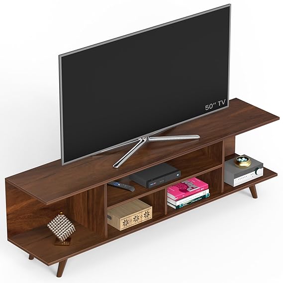 Infuse your living room with a chic, mid-century modern vibe using this beautifully designed TV console, finished in a warm, rich walnut tone. The long, low profile and flared wood legs create a sophisticated foundation for screens up to 50 inches, seamlessly blending form and function. Featuring three open shelves, this unit offers ample, accessible space to display media components, books, and decorative accents.
