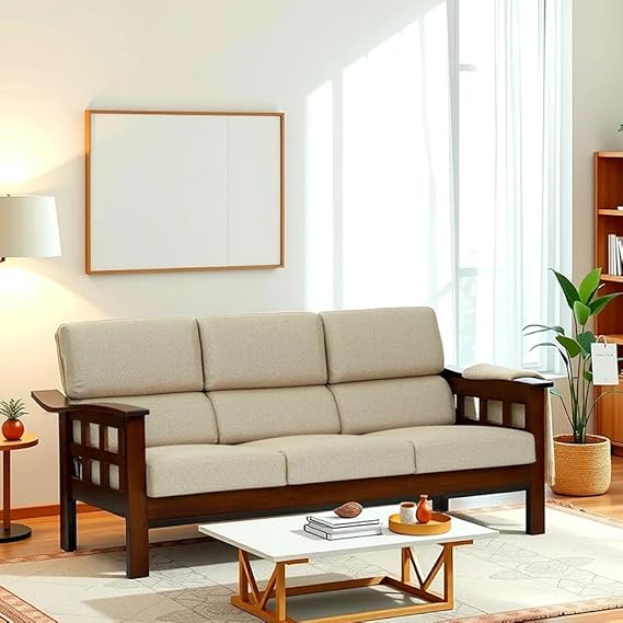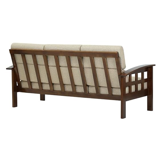 This traditional 3-seater sofa features a sturdy, dark wood frame with classic slatted armrests, offering a timeless aesthetic that seamlessly fits into any traditional or rustic home setting. The generously cushioned seating and high backrests are upholstered in a textured, neutral fabric, providing exceptional comfort and support for everyday lounging. Combining durable craftsmanship with comfortable elegance, this sofa is an enduring focal point for your living room.