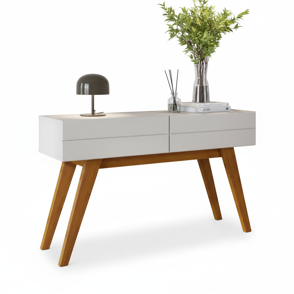 This contemporary console table offers a sophisticated, two-tone aesthetic, pairing a crisp white tabletop with warm, angled wooden legs for a stylish Mid-Century Modern look. It provides excellent functionality with two seamless drawers that offer a neat and concealed space for organizing everyday items in your entryway or living area. The compact yet impactful design is ideal for smaller spaces, offering a perfect surface for decorative items, lamps, or a drop-off zone.