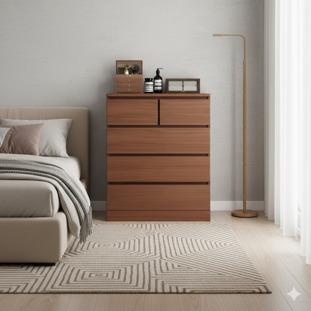 This spacious five-drawer chest features a rich, warm wood finish with a modern, streamlined silhouette and minimalist rectangular drawer pulls. The top level includes two smaller split drawers, complemented by three wide drawers below, offering versatile organization for all your essentials. Its generous height and classic design make it an ideal, durable storage solution for the bedroom or any area needing a substantial, stylish piece.