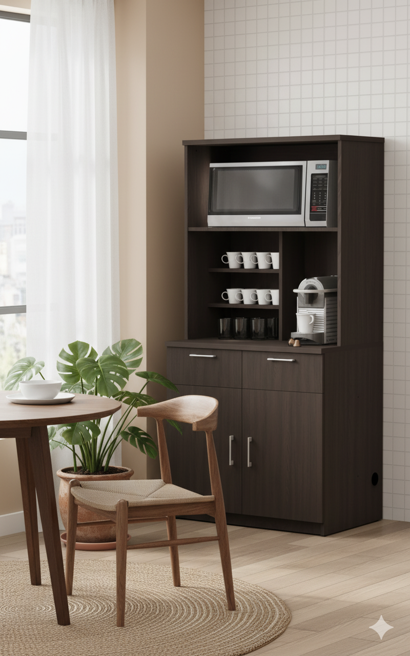 This multi-functional kitchen hutch features a rich, dark wood finish and an intelligent design perfect for creating a dedicated beverage station in your home or office. The unit includes a large open compartment for a microwave, specialized shelving for cups and glasses, and a countertop area ideal for your coffee maker. Below, two spacious drawers and a large lower cabinet with doors provide ample closed storage for supplies, linens, and pantry essentials, keeping everything neat and accessible.