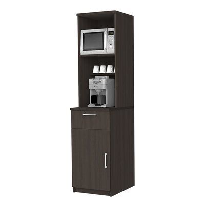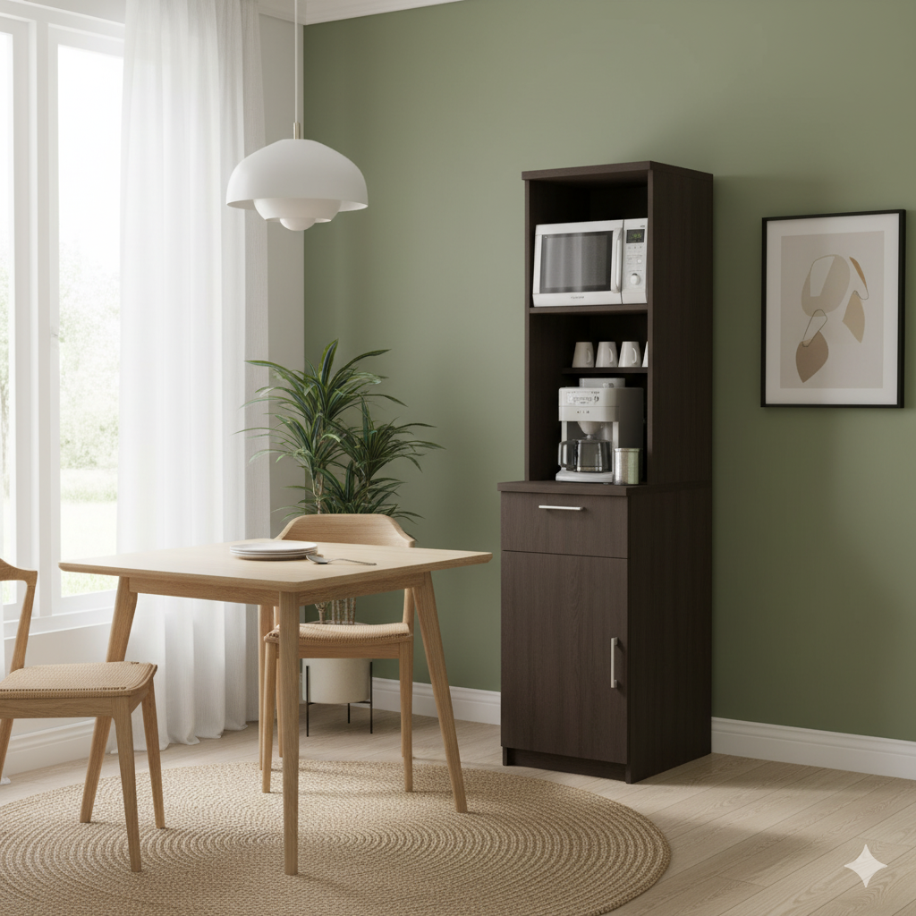 This space-saving, vertical pantry cabinet is expertly designed for modern convenience, featuring dedicated upper compartments ideal for housing a microwave and setting up a dedicated coffee station. The compact unit includes a smooth-gliding drawer for utensils and a large lower cabinet with a door, offering generous storage for plates, mugs, and essential dry goods. Its tall, narrow profile and rich espresso finish make it an ideal, discreet solution for maximizing storage in small kitchens, offices, or dorm rooms.
