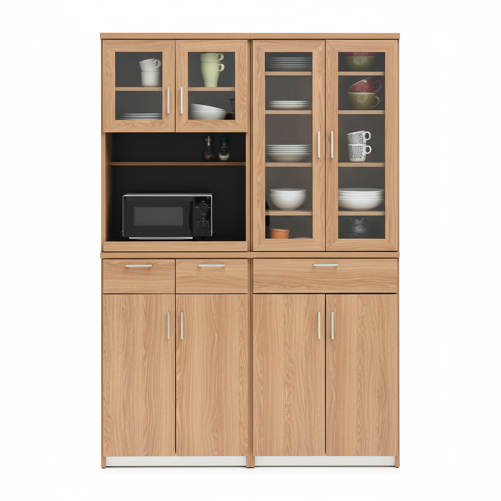 This spacious and versatile kitchen hutch offers extensive storage and display space with a clean, light wood-grain finish that beautifully complements any modern interior. It features a clever central design with a dedicated shelf for a microwave and an open countertop, flanked by multiple glass-front cabinets perfect for showcasing your finest crockery and glassware. Below, a combination of smooth-gliding drawers and large, closed cabinets provides maximum concealed storage for all your bulk items and cookware.