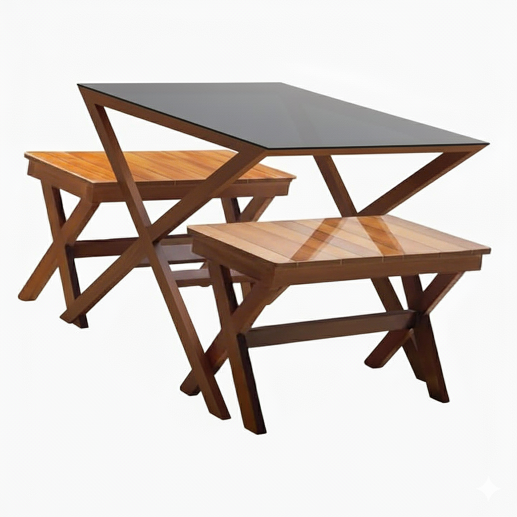 This unique, space-saving kitchen set features a striking criss-cross wooden design crafted from rich, warm wood, perfect for modern or compact living areas. The main table is elegantly topped with dark, sleek glass, providing a stylish and easy-to-clean surface that complements the natural wood benches. Designed for both form and function, this versatile table set instantly adds a touch of contemporary sophistication to any home.