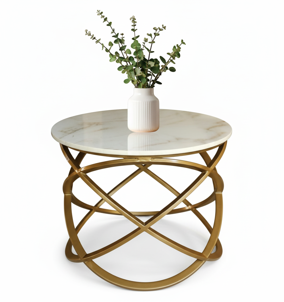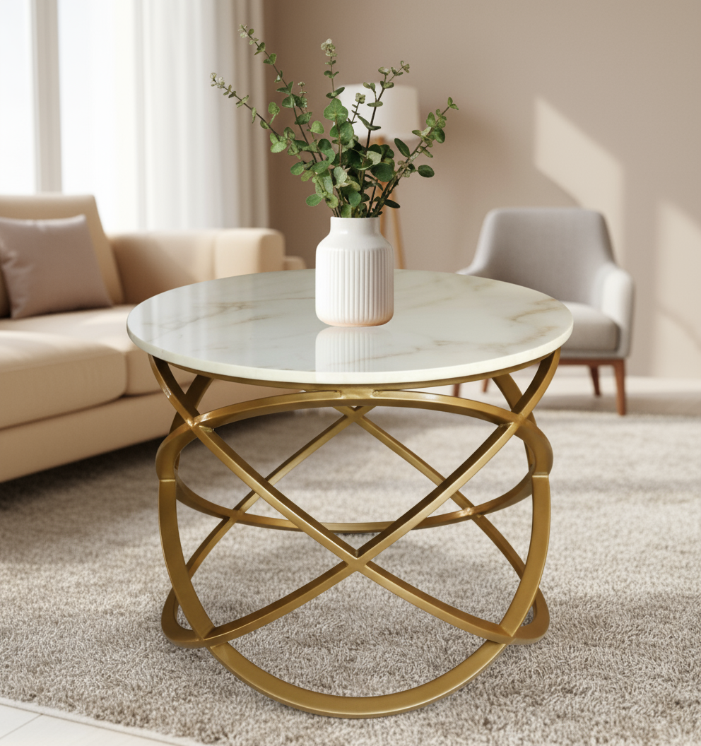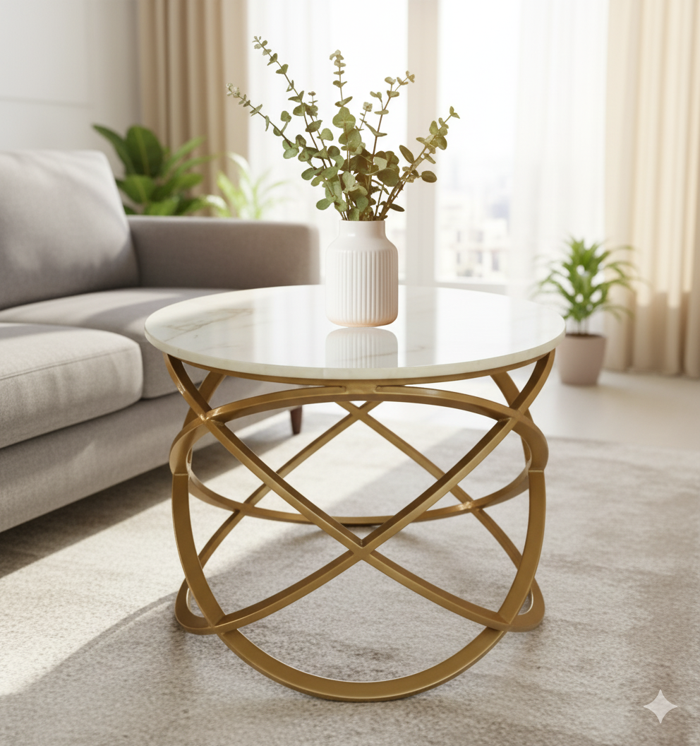 Elevate your living space with this elegant coffee table, featuring a luxurious white marble top and a stunning gold-tone metal base. The sculptural, interlocking frame creates a sense of modern artistry and visual interest from every angle. This chic and functional piece is a perfect centerpiece, seamlessly blending sophistication and contemporary style into your home decor.